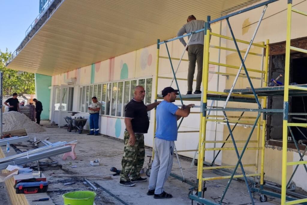 Вошли в активную фазу и работы по ремонту фасадов. На сегодняшний день все здание обнесено строительными лесами, установлены направляющие, по которым размещен утеплитель, после чего фасады будут «зашиваться» линеарными панелями. Крыльцо тоже «в фокусе»: установлены закладные детали, будет устанавливаться новое ограждение «входной группы».