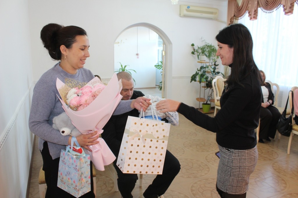 А пока, в красивой, праздничной обстановке начальник отдела ЗАГС администрации Октябрьского муниципального района Виктория Леонидовна Морозова торжественно приветствовала нового земляка, Степана Викторовича Банько, и вручила многодетным родителям его первый государственный документ – свидетельство о рождении. Остальные гости праздника дарили виновникам торжества цветы, а заодно – милые и полезные для малыша подарки.