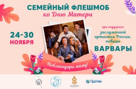 30 ноября в нашей стране отмечается замечательный праздник – День матери. В преддверии праздника Фонд Андрея Первозванного при поддержки Заслуженной артистки Российской Федерации Варвары запускает большой семейный флешмоб и приглашает всех к участию!