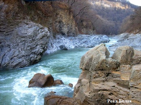 Останавливаемся в гостевом доме в поселке Каменномостский. Не знаете такого места? Но о Хаджохе, скорее всего, слышали; так вот, это одно и то же. Недалеко, промывая себе дорогу в крутых скалах, течет река Белая. Хрусталь реки, зажатой в теснине, кажется, сейчас раздвинет каменные берега – настолько осязаема ее мощь. Глубина узкой теснины достигает до 20 метров. И это захватывающее зрелище! Пороги и перекаты – зима ли, лето, ничего не меняется в бурном нраве реки. Но вот вырывается она на простор и становится немного степенней, если это слово можно применить к горной реке. Со смотровой площадки, а также с моста, построенного через реку, можно часами наблюдать за потоком чистейшей воды, шум которого слышен даже у нас, в гостевом доме.
