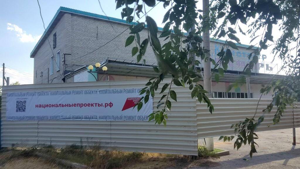 За строительным забором вокруг здания Центра культуры и кино «Октябрьский» не видно, что конкретно там происходит, но по огромному баннеру, который украшает эту ограду, можно понять, что работы по капитальному ремонту здания здесь ведутся в рамках нацпроекта, а точнее федерального проекта «Семейные ценности и инфраструктура культуры (Культура для семьи)» национального проекта «Семья».