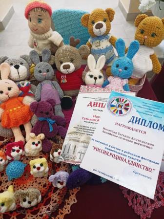 В этом году Татьяна вышла на новый уровень и представила свое творчество на районном фестивале национальных культур «Россия. Родина. Единство», где была отмечена Дипломом за активное участие. Это, несомненно, принесло удовлетворение мастерице, ведь признание – неотъемлемая часть творчества.
