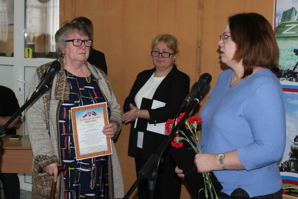 Главной наградой матери за то, что продолжает жить и всеми силами пытается облегчить будни нашим защитникам на СВО, стало Благодарственное письмо от артиллерийского дивизиона Юг РШБр «Святой Георгий» за оказываемую гуманитарную помощь и неравнодушие к судьбам бойцов разведывательно-штурмовой бригады, врученное ей директором школы в торжественной обстановке: